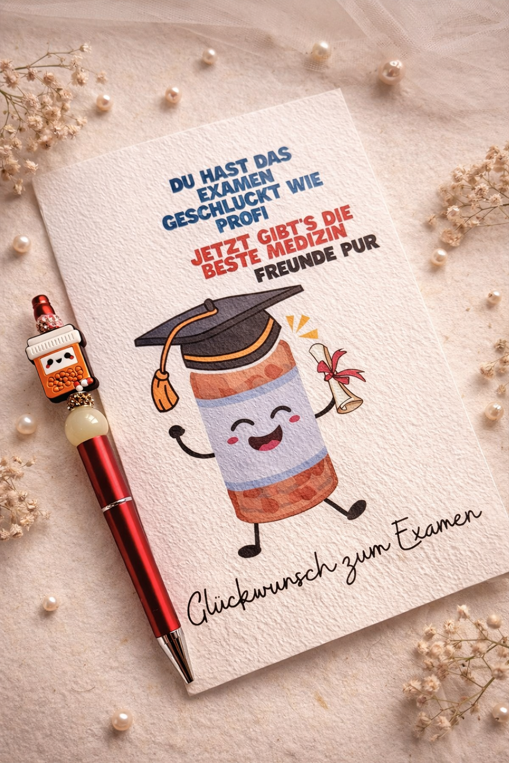 Eine liebevoll gestaltete Glückwunschkarte für alle, die ihr Examen in Pflege oder Medizin bestanden haben.